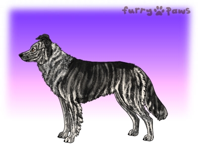 | Description: | 4E 22HH Roaned Brindle Silver and White (Irish) with Black Sable |
