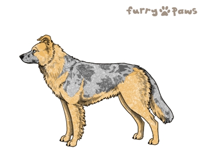 Color: | Roaned Fawn Merle and White (Extreme Piebald) with Blue Saddle and Mask |