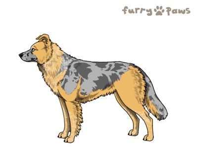 | Color: | Roaned Fawn Merle and White (Irish) with Blue Saddle and Mask |