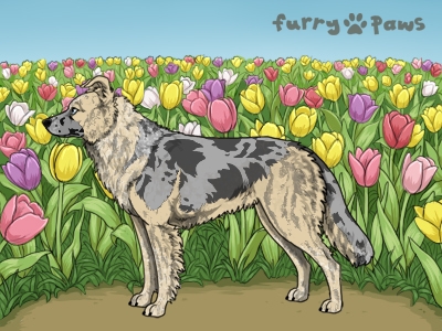 Color: | Roaned Brindle Cream Merle and White (Irish) with Blue Saddle and Mask |