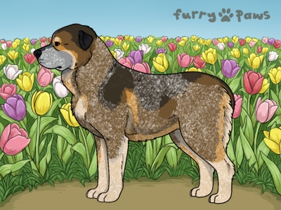 | Color: | Roaned Fawn and White (Piebald) with Black Grizzle, Mask, and Light Undersides |