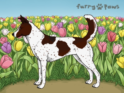 Color: | Red and White (Piebald) with Black Grizzle, Ticking, and Light Undersides |