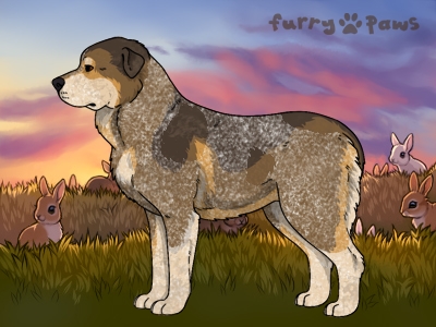 | Color: | Roaned Fawn and White (Piebald) with Black Grizzle and Light Undersides |