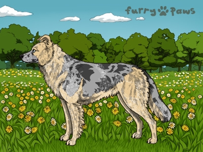 | Color: | Roaned Brindle Cream Merle and White (Piebald) with Blue Saddle and Mask |