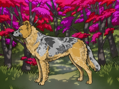 Color: | Roaned Fawn Merle and White (Piebald) with Blue Saddle and Mask |