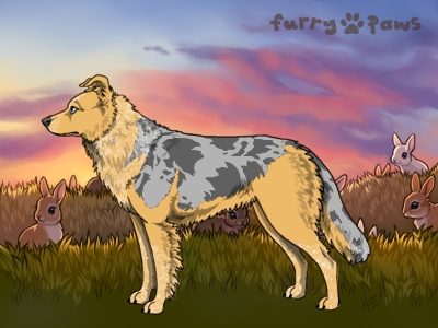 Color: | Roaned Fawn Merle and White (Irish) with Blue Saddle |