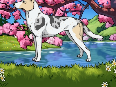 | Color: | Cream Merle and White (Piebald) with Blue Saddle and Ticking |